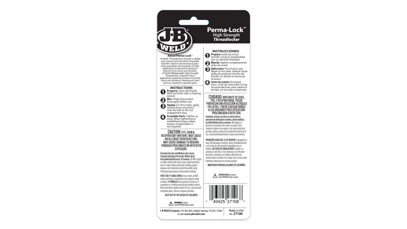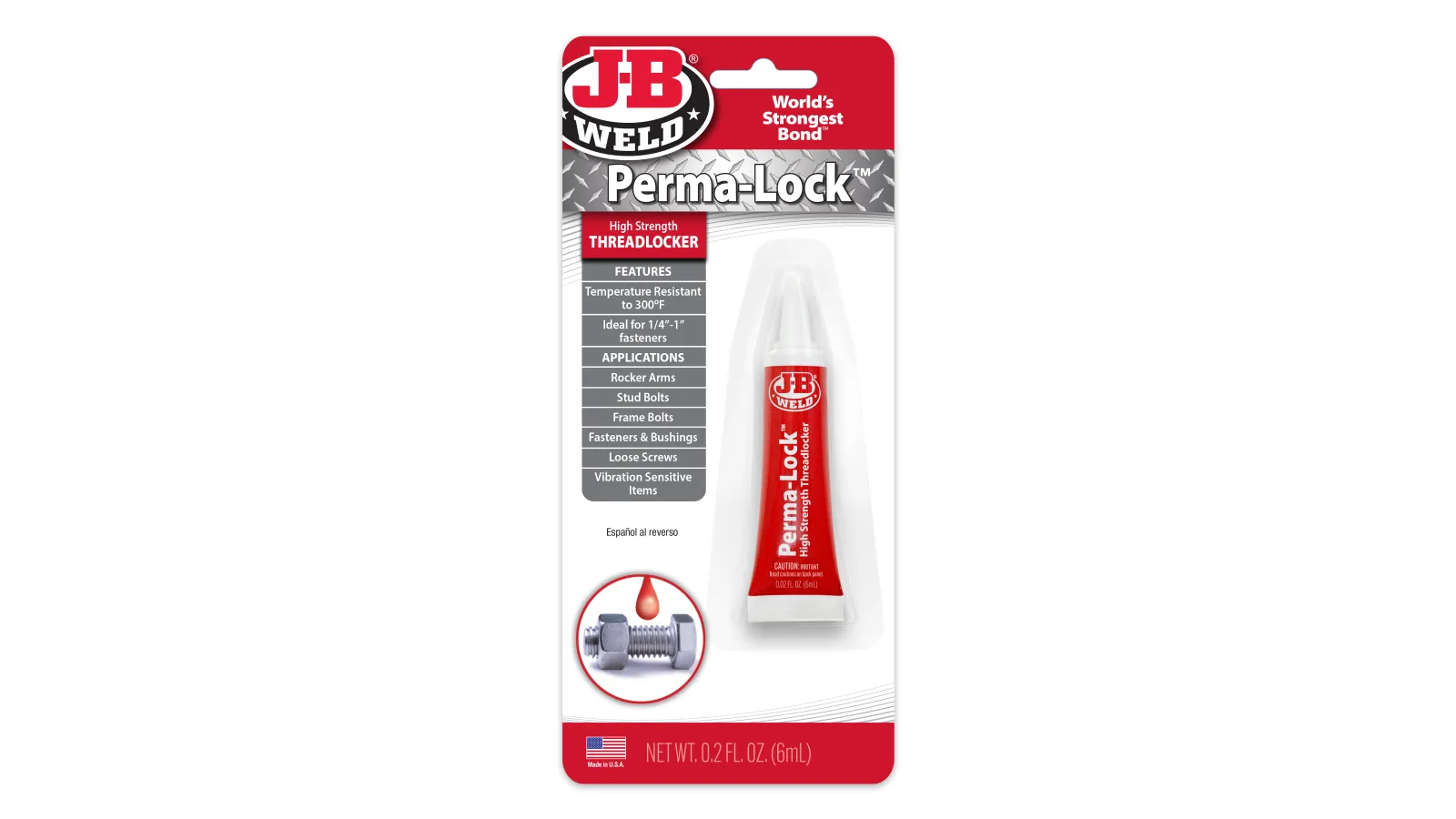 J-B Weld Threadlockers provide a reliable and superior lock and seal for threaded fasteners. Ideal on all mechanical parts, body assemblies, and hundreds of other applications to prevent loosening of fasteners from shock and vibration. J-B Weld Perma-lock High Strength Threadlocker is ideal for heavy-duty applications requiring resistance to severe shock and vibrations. Heating and hand tools are required to separate parts.