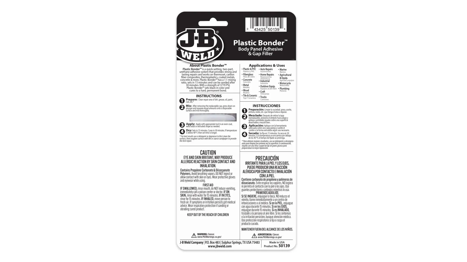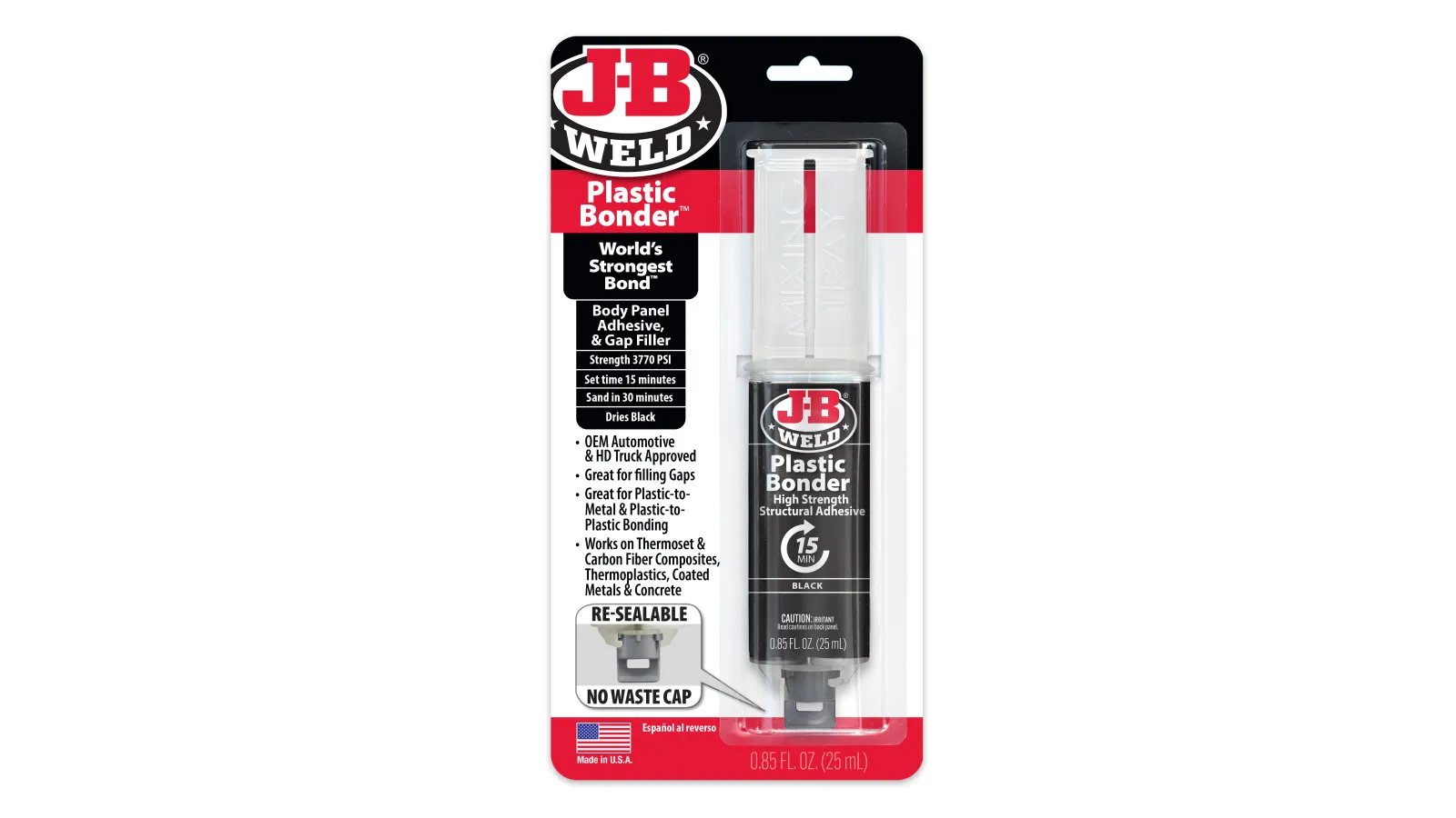 PlasticBonder™ is a quick-setting, two-part, urethane adhesive system that provides strong and lasting repairs and works on thermoset, carbon fiber composites, thermoplastics, coated metals, concrete & more. PlasticBonder™ has a 1:1 mixing ratio, sets in 15 minutes and can be sanded after 30 minutes. With a tensile strength of 3770 PSI, PlasticBonder™ sets black in color and cures to a hard, permanent bond.