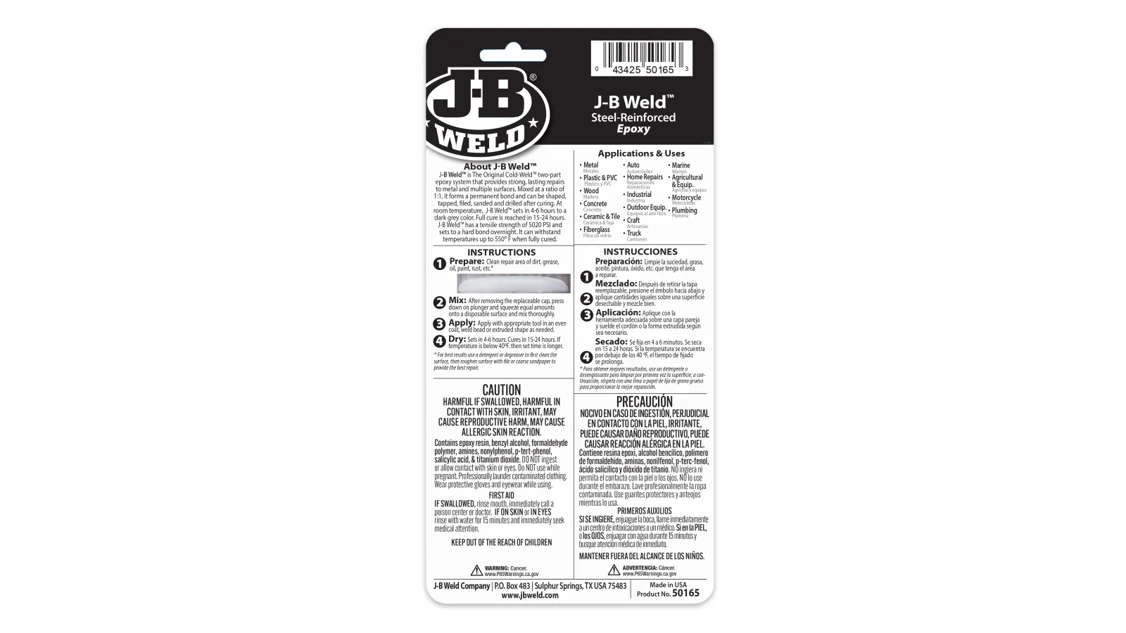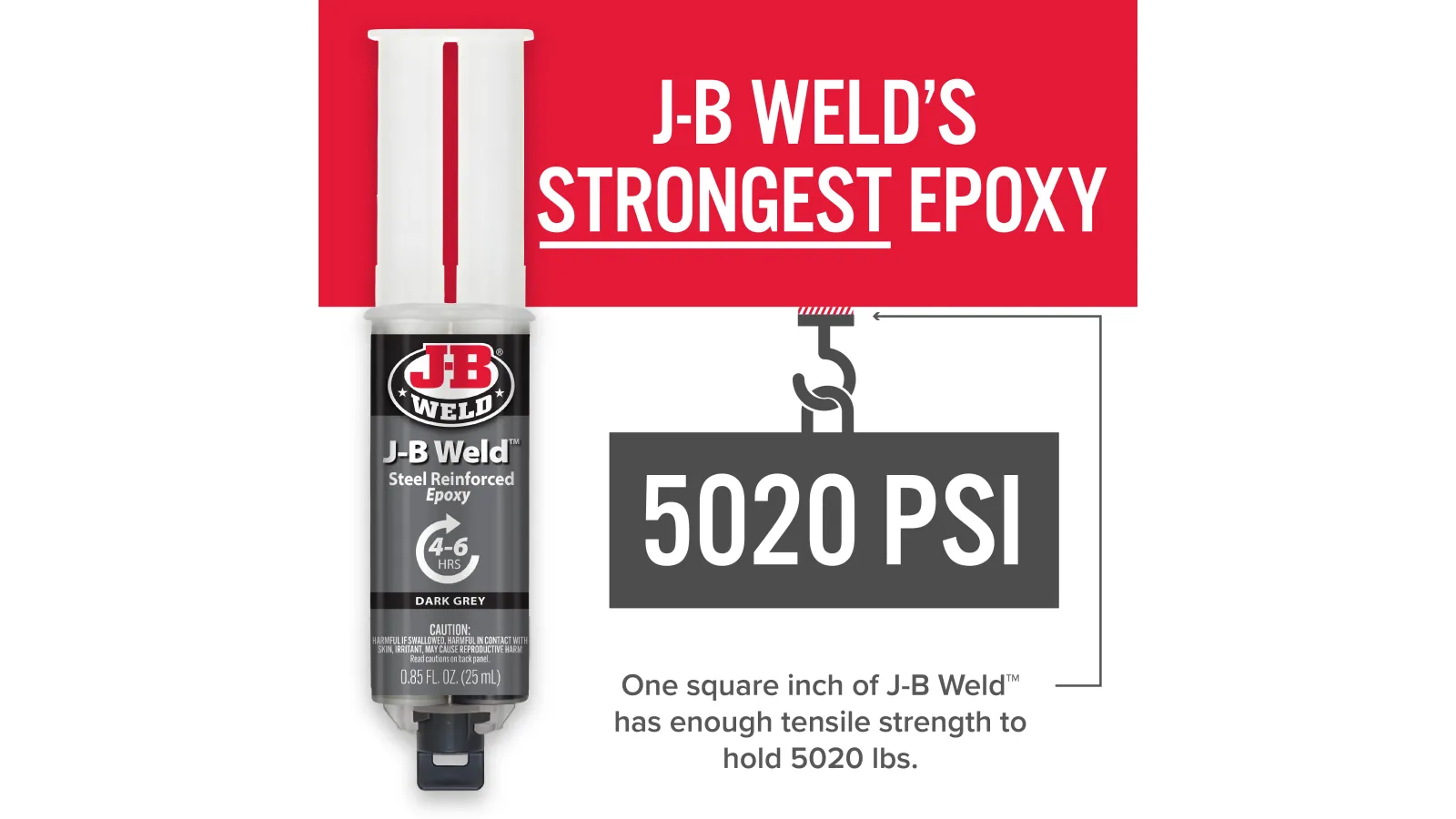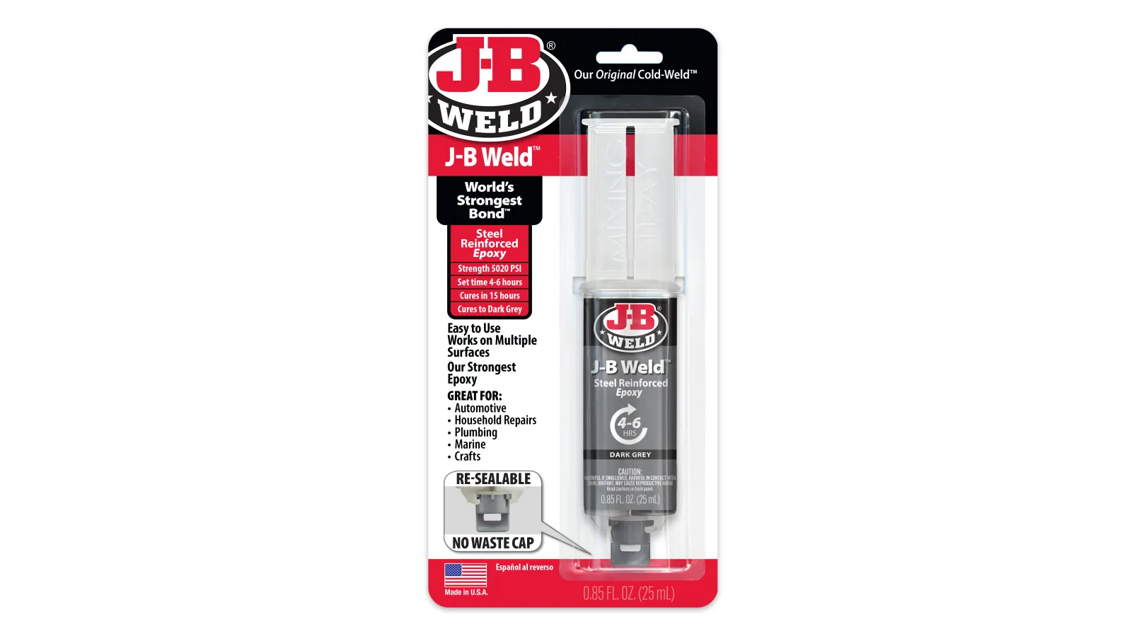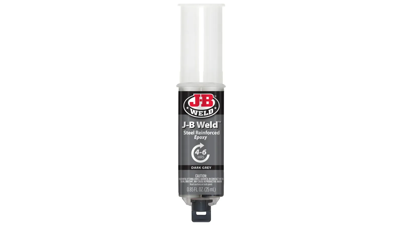 J-B Weld™ Syringe is the original cold-weld™ two-part epoxy system that provides strong, lasting repairs to metal and multiple surfaces. Mixed at a ratio of 1:1, it forms a permanent bond and can be shaped, tapped, filed, sanded and drilled after curing. At room temperature, J-B Weld™ sets in 4-6 hours to a dark grey color. Full cure is reached in 15-24 hours. J-B Weld™ has a tensile strength of 5020 PSI and sets to a hard bond overnight. It can withstand temperatures up to 550⁰ when fully cured.