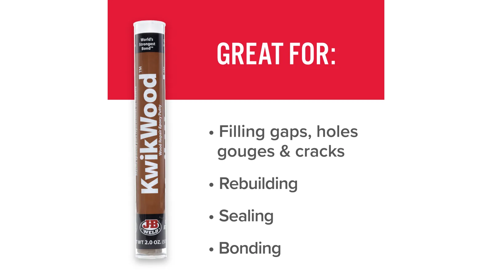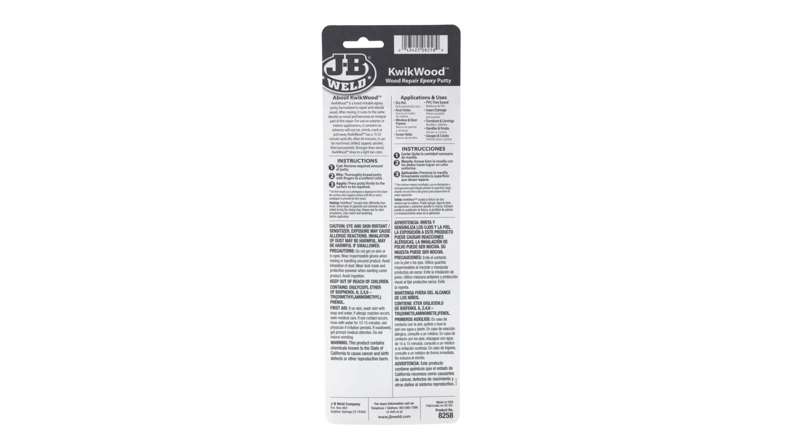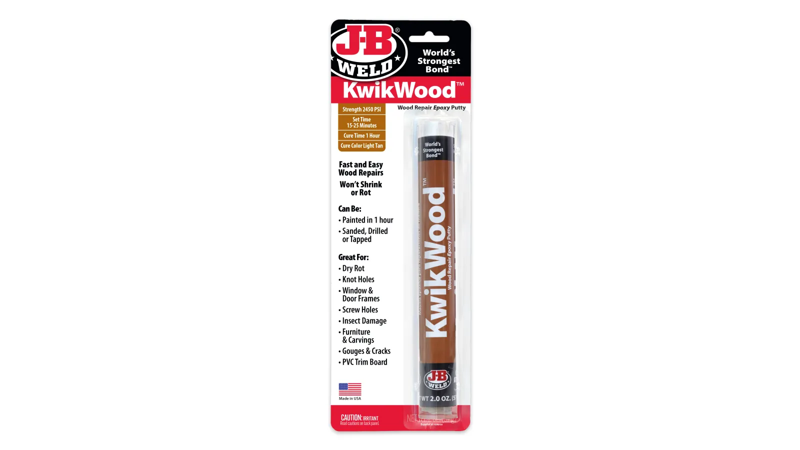 KwikWood™ is a hand-mixable epoxy putty, formulated to repair and rebuild wood. After mixing, it cures to the same density as wood and becomes an integral part of the repair. For use on exterior or interior applications, it contains no solvents, will not rot, shrink, crack or pull away. KwikWood™ has a 15-25 minute work life. After 60 minutes, it can be machined, drilled, tapped, sanded, filed and painted. Stronger than wood, KwikWood™ dries to a light tan color.