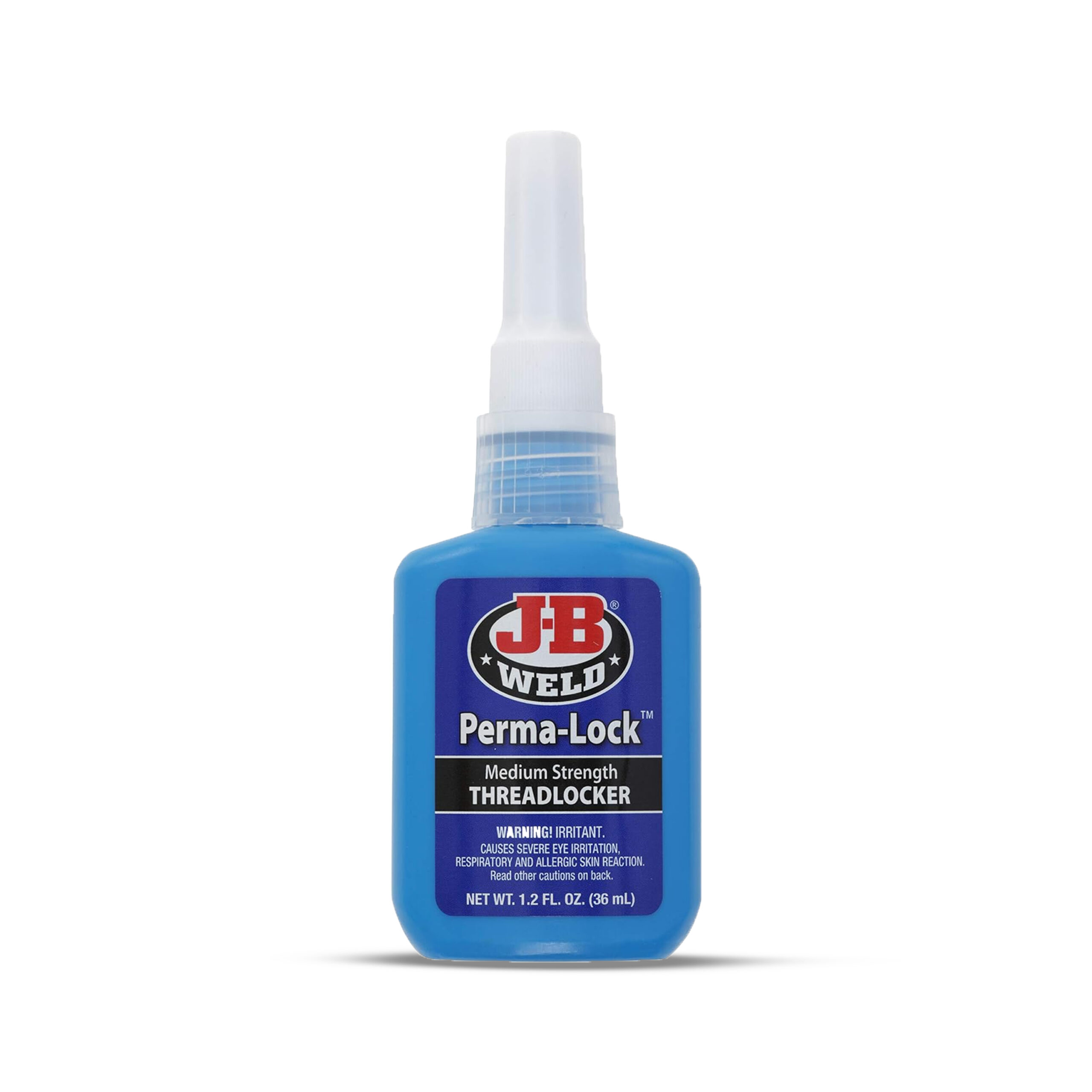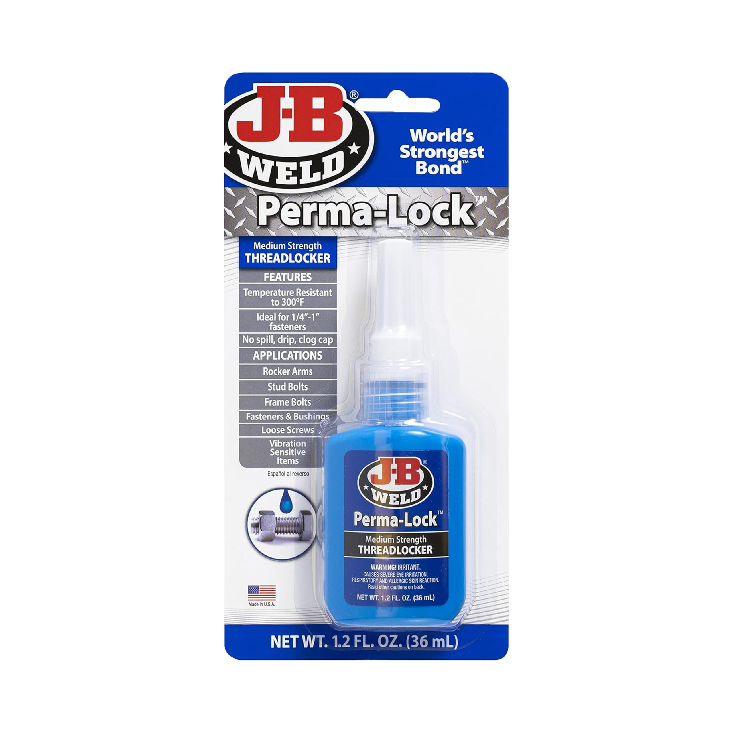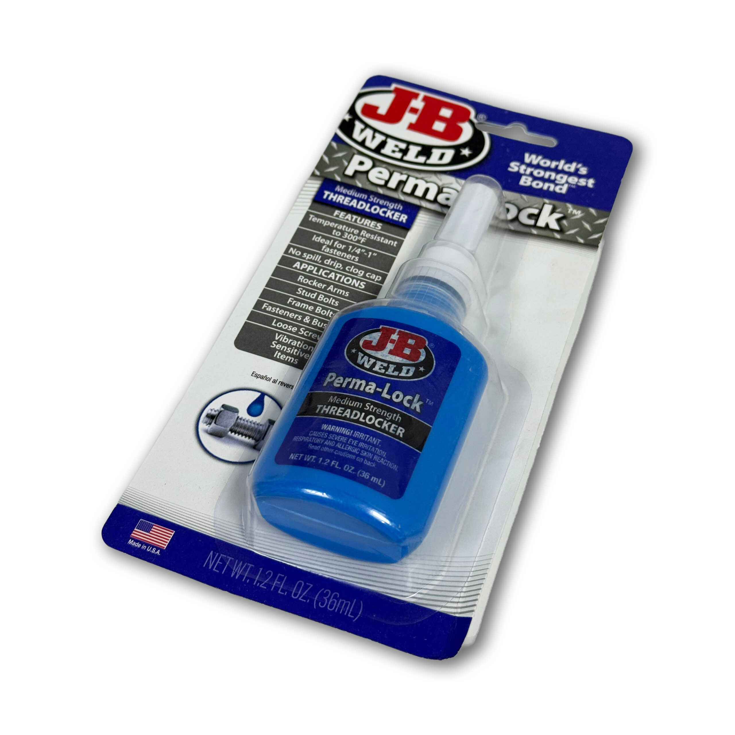 The J-B Weld 24236 Perma-Lock is a medium-strength, blue liquid threadlocker designed to secure and seal threaded fasteners (bolts, nuts, screws) against loosening from shock and vibration, while allowing for eventual disassembly with hand tools. It prevents rust, resists temperatures up to 300°F, and is used on various mechanical parts, offering reliable, DIY-friendly locking for many automotive and household tasks.