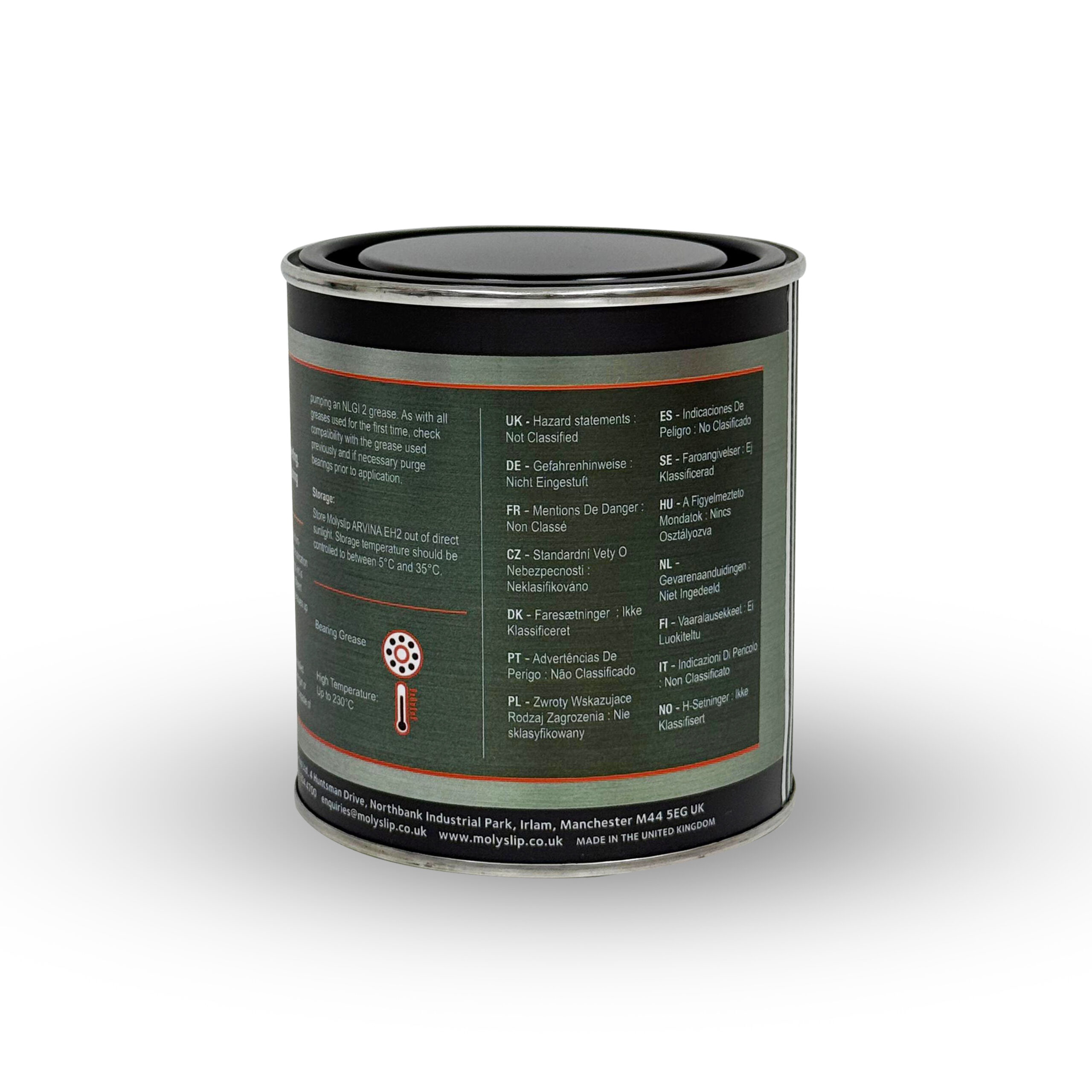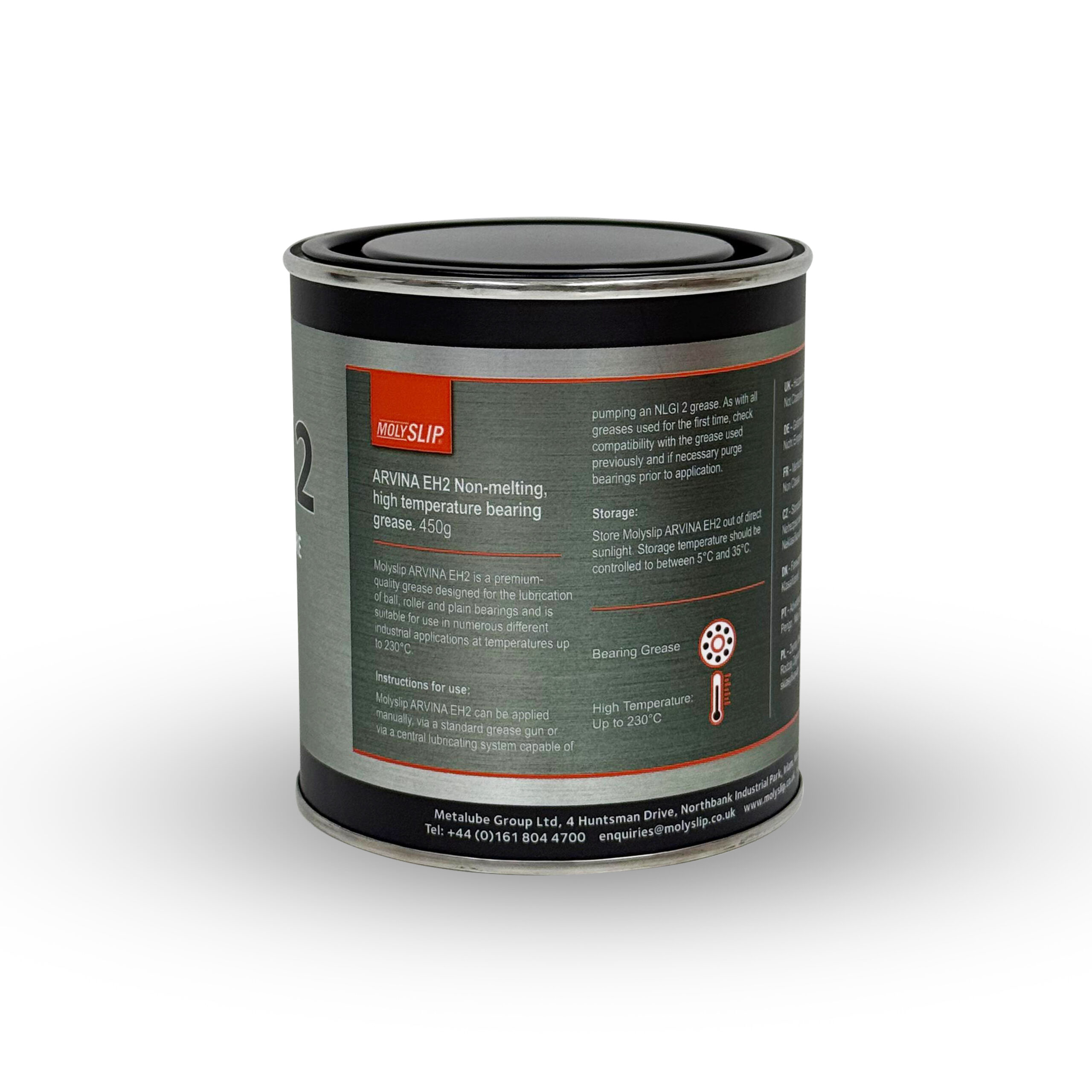 MOLYSLIP ARVINA EH2 is a premium quality grease designed for the lubrication of ball, roller and plain bearings operating in high temperature environments. ARVINA EH2 contains a semi-synthetic base oil thickened with an organo-modified bentonite clay, fortified with anti-oxidant, extreme pressure, anti-wear and corrosion inhibiting additives. The load carrying ability is further enhanced by the inclusion of micronized molybdenum disulphide (MoS2) which forms an ultra-low friction solid lubricant film. MOLYSLIP ARVINA EH2 has excellent high temperature tolerance and good anti-wear characteristics which reduce friction and protect bearings from damage caused by and wear and shock loading. ARVINA EH2 is suitable for use in numerous different industries at temperatures up Molyslip Arvina EH2 3to 230°C.