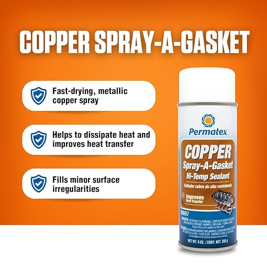 Permatex Copper Spray-A-Gasket Hi-Temp Sealant is an aerosol product formulated as a sealant which helps dissipate heat, prevents gasket burnout and improves heat transfer